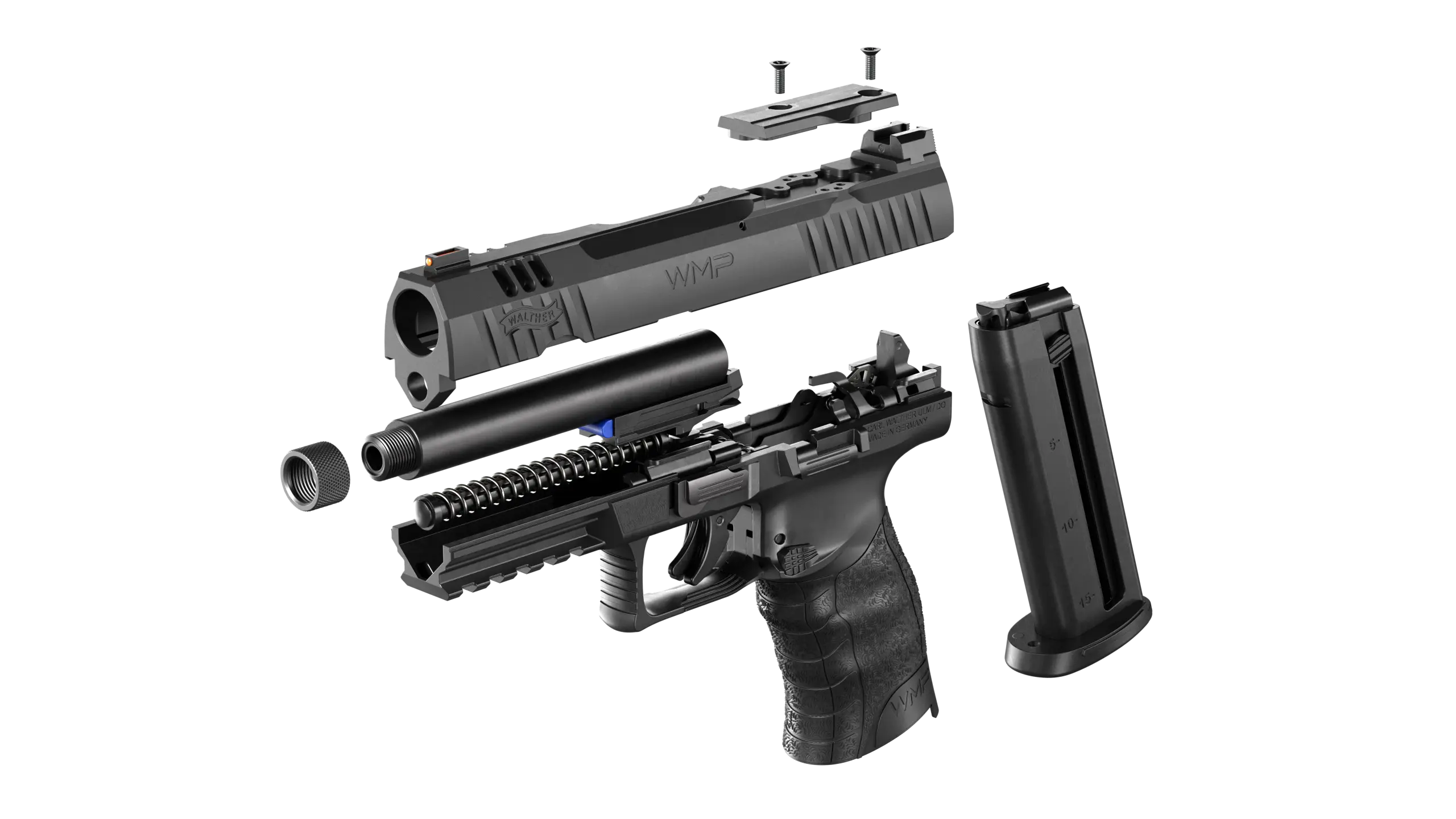 The Walther WMP comes equipped with two 15-round magazines (or 10-round magazines for the WMP SD, Item Number: 5220302, sealed for state compliance), two optics adapter plates, and easy field strip capabilities, ready for action out of the box. Note: 10-round magazines are marked for 15 rounds but blocked to 10, and disassembly may damage them, rendering them inoperable.