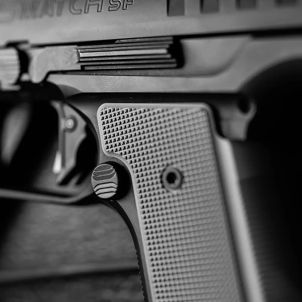 Crafted from high-strength aluminum with a modern gray anodized finish, these checkered grip panels deliver exceptional texture for a secure, non-slip hold in any condition. The innovative thinner design reduces the side profile of the grip, shortening reach to the trigger and magazine release for faster draws, quicker mag changes, and enhanced ergonomics—perfect for shooters with medium to smaller hands.